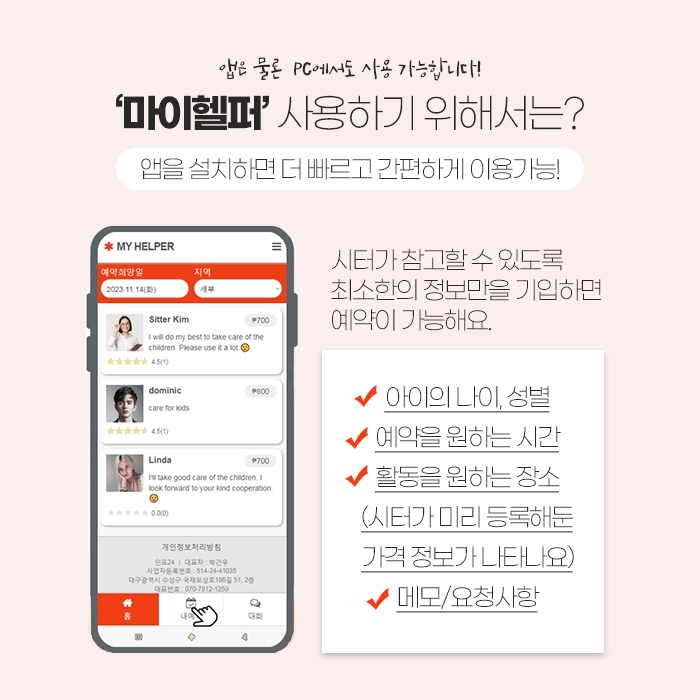 그래서 직접 보면서 세부 시터 선택과 예약할 수 있도록 마이헬퍼를 이용해보는 걸 권해드리는데요. 이런 마이헬퍼는 PC와 앱 모두 사용할 수 있고 앱을 설치하면 더 빠르고 간편하게 이용해보는 것이 가능할 수 있겠습니다.