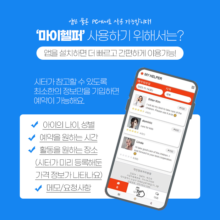 그래서 직접 보며 필리핀 시터 선택을 하고 예약을 할 수 있도록 마이헬퍼를 이용해보는 걸 권해드리는데요. 이런 마이헬퍼는 PC와 앱 모두 사용할 수 있고 앱을 설치하면 더 빠르고 간편한 이용도 가능합니다.