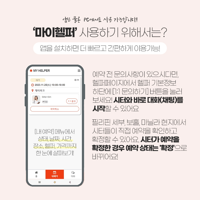 마이헬퍼는 현지의 베이비시터들이 예약을 직접 확인하고 난 후에 확정을 할 수 있습니다. 그리고 시터가 예약을 확정하고 난 후에는 예약 확정상태로 바뀌게 되는데요. 확정이 되기 전 단계에서는 언제든 예약 취소를 하실 수 있답니다. 그리고 내 예약 메뉴로 들어가면 현재 나의 예약 상태와 날짜, 시간, 그리고 장소, 헬퍼, 가격까지 한 눈에 살펴보실 수 있어 쉽게 상황을 알 수 있습니다. 그리고 예약 상태와 관계없이 헬퍼와 1:1로 소통을 하실 수 있습니다.