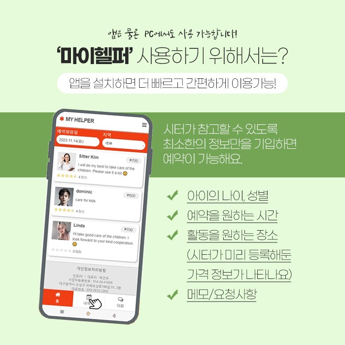 반대로 마이헬퍼를 통해서 자신이 어떻게 아이를 보살필 수 있고 여행을 온 아이들도 즐거운 시간을 보낼 수 있게 하는지 어필하는 시터들도 있답니다. 쉽게 찾을 수 있는 정보를 확인하시고 이제 세부 시터 구하는 문제로 혹은 시터 자리를 구하는 문제로 혼자 고민하지 마시기 바라겠습니다.