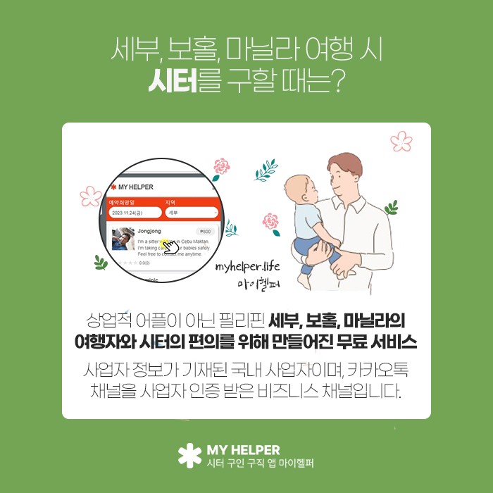 또한 잘 관리가 되지 않는다면 아무래도 앱을 사용하고 싶어도 사용하는데 있어 주저할 수밖에 없는데요. 마이헬퍼는 해외 사업자가 아니라 국내 사업자라고 하며 카카오톡 채널 또한 사업자 인증을 받은 비즈니스 채널입니다. 그렇기에 더욱 신뢰하며 세부 시터 찾기 위해서 사용하셔도 좋겠습니다.