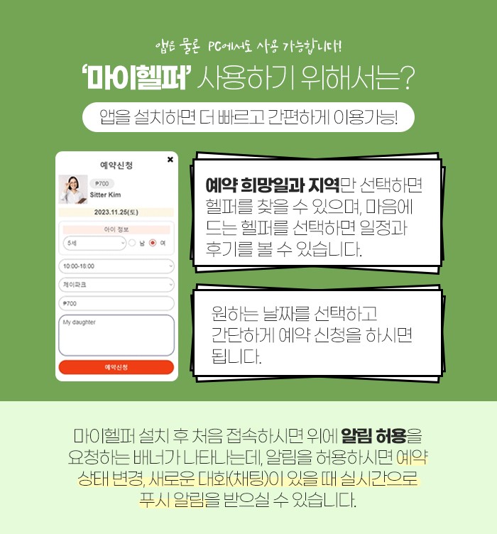 마이헬퍼를 통해 베이비시터 자리를 찾고 내가 어떻게 아이를 돌보아 주고 아이들도 좋은 추억을 만들 수 있게 하는지 어필하는 시터도 있습니다. 이제 시터 구인, 구직으로 혼자 고민하지 마시길 바랍니다!