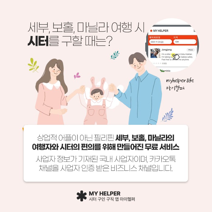 직접 여행을 가다가 베이비시터를 구하는데 어려움을 느끼며 이러한 문제를 해소하기 위해서 만들어진 앱으로 마이헬퍼는 상업적이기만 한 어플이 아니라 필리핀 세부와 보홀, 마닐라로 여행을 떠나는 분들과 시터의 편의를 위해 만들어진 무료 서비스를 이용하실 수 있는 앱이라고 합니다.